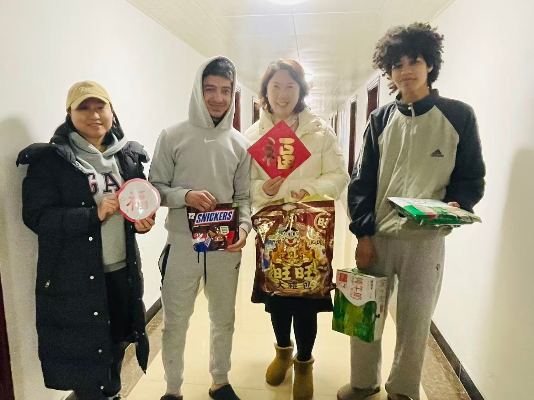 Teachers also presented carefully prepared New Year “Fu” characters and gifts to every International student staying on campus. The red Fu characters, full and auspicious, are the most iconic symbol of the Spring Festival, carrying the university’s wishes for students’ safety, happiness, academic success and all the best. Teachers handed out New Year gifts, helped students paste the Fu characters, and took group photos with everyone warmly. International students were all smiling with joy.